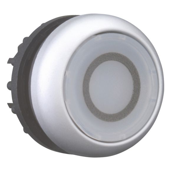 M22-DRL-W-X0, tipka, bela O, svetleča, ravna, zaskočna, titan obroček