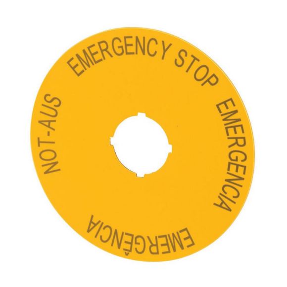 M22-XAK2, napisna ploščica, samolepilna, rumena, d=90mm, napis "Emergency stop" v 4 jezikih:, DE, EN, ES, PT
