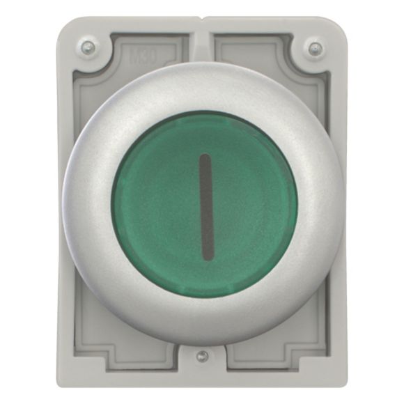 M30C-FDRL-G-X1, tipka, zelena I, svetleča, ravna, zaskočna, obroček metal/titan