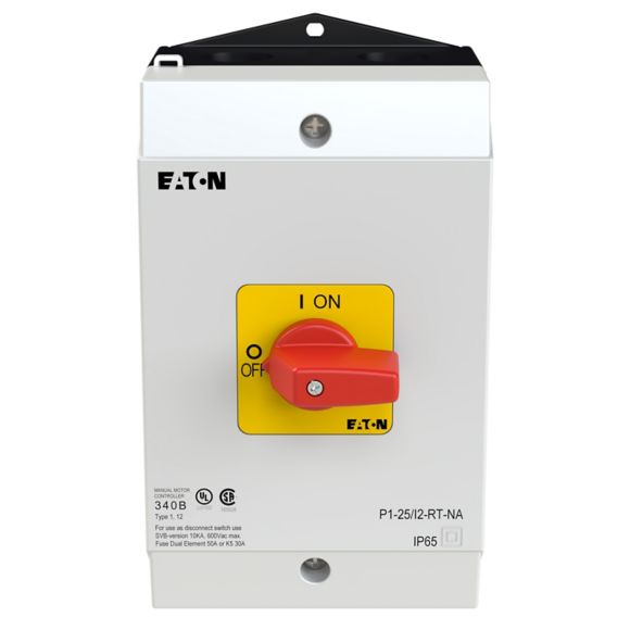 P1-25/I2-RT-NA, ON-OFF stikalo, P1, 25 A, v ohišju, 3 polni, "Nujni stop" funkcija, rdeče rumena ročica, UL/CSA