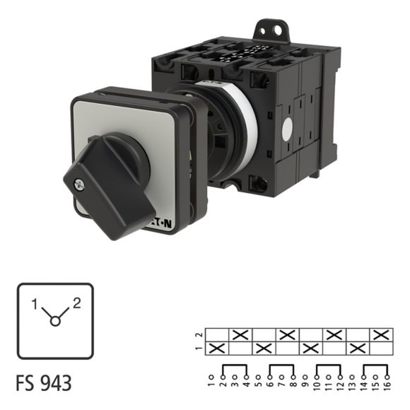 T3-4-8223/Z, preklopno stikalo, T3, 32 A, oddvojena vgradnja, 8 kontaktov, 90 °, brez 0 (Off) pozicije, 1-2